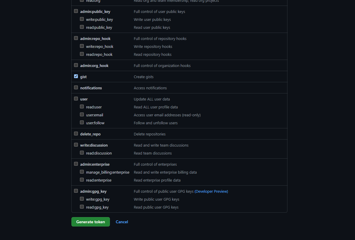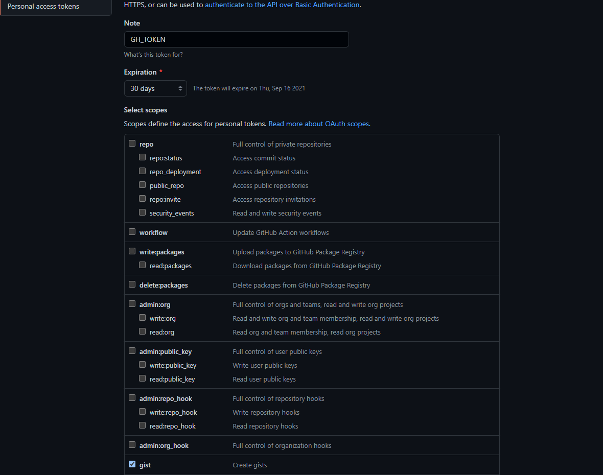 이 곳으로 들어가 Note(token 명)를 GH_TOKEN으로 입력해주시고 Expiration을 No expiration으로 설정, gist항목을 check하시고 새로운 토큰을 발급받습니다. 기존에 발급받으신 분들은 가지고 계신 token값을 그대로 이용해도 됩니다.