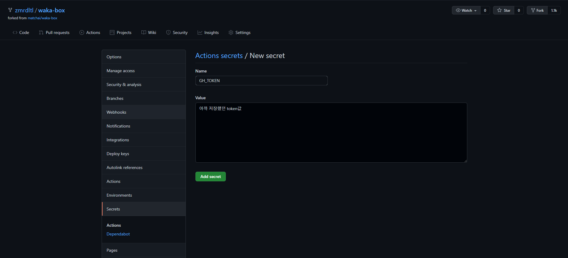 fork했던 repository로 들어가 settings로 들어가면 하기에 secrets라는 항목이 있습니다. 이를 클릭하시면 우측 상단에 New repository secret라는 버튼이 있습니다. 여기로 들어가 Name : GH_TOKEN, Value : 발급받은 토큰값을 입력하고 Add secret버튼을 눌러줍니다. 이 방법 대로WAKATIME_API_KEY, GIST_ID를 name으로 해서 맞는 value값을 넣어주고 Add secret버튼을 눌러줍니다.