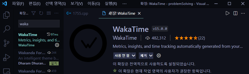 wakatime api가 정보를 끌어올 곳을 정해 그곳에 plugin을 설치해야 합니다. 이후 설치된 IDE에 사용자가 작성한 코드들의 시간과 언어를 분석해 wakatime 서버에 저장하게 됩니다. 제 경우에는 vs code에 wakatime plugin을 설치하도록 하겠습니다. 마켓에서 waka만 쳐도 이렇게 extenstion이 나옵니다. 이를 설치해줍니다.