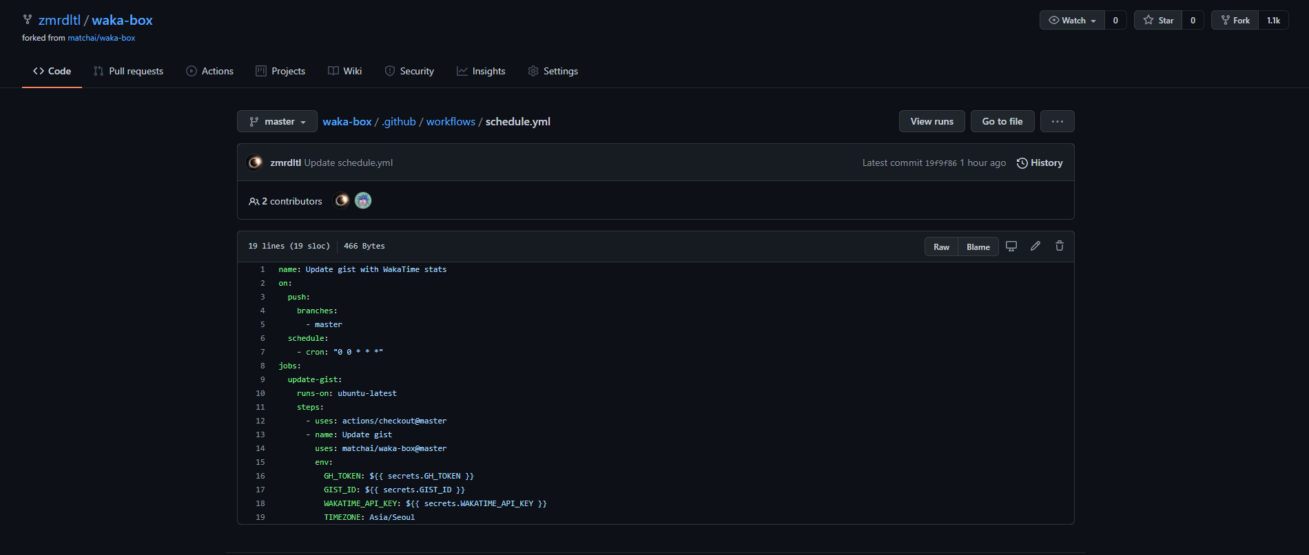 제 프로필에 다음 사진과 같은 ui를 추가하는 방법을 포스팅하겠습니다. 1. Project fork하기 원작자의 project에서 시간대를 한국/서울시 기준으로 맞추기 위해 약간 수정되었다고 합니다. 아래 reposit