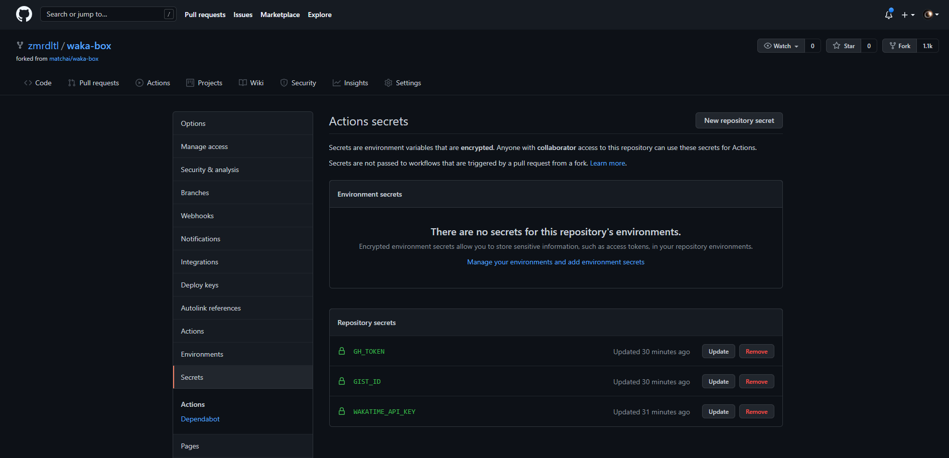 이제 저희는 3개의 정보를 저장했습니다. GIST_ID, WAKATIME_API_KEY, GH_TOKEN 입니다.