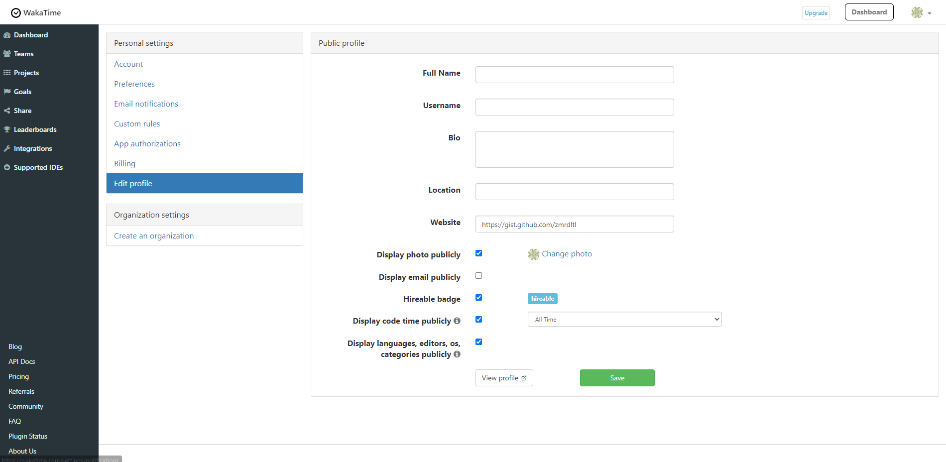 로그인 이후 https://wakatime.com/settings/profile 이곳에서 몇 가지 정보를 수정해야 합니다. (Display coding activity publicly), (Display languages, editors, operating systems publicly) 이 두가지를 check해주세요.