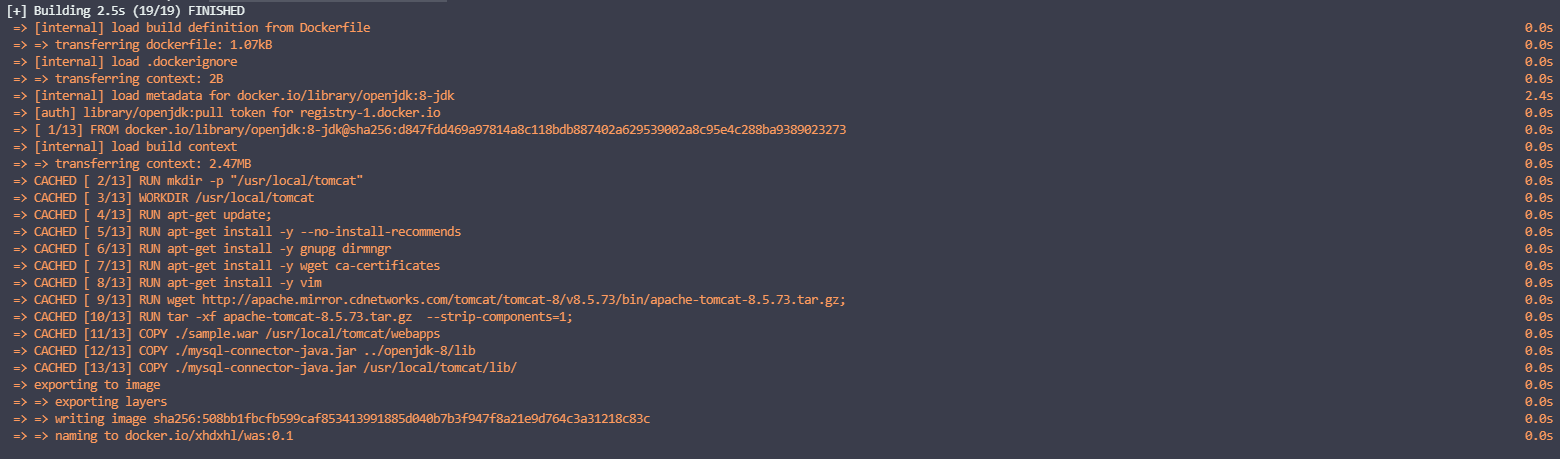 docker daemon을 실행해주시고 다음 명령어로 작성한 Dockerfile을 이용, jdbc.jar, sample.war과 함께 tomcat을 docker hub에서 받아와 image를 build해줍니다. 이를 위해서 작업한 dir경로의 terminal에서 하기와 같은 명령어를 실행합니다.