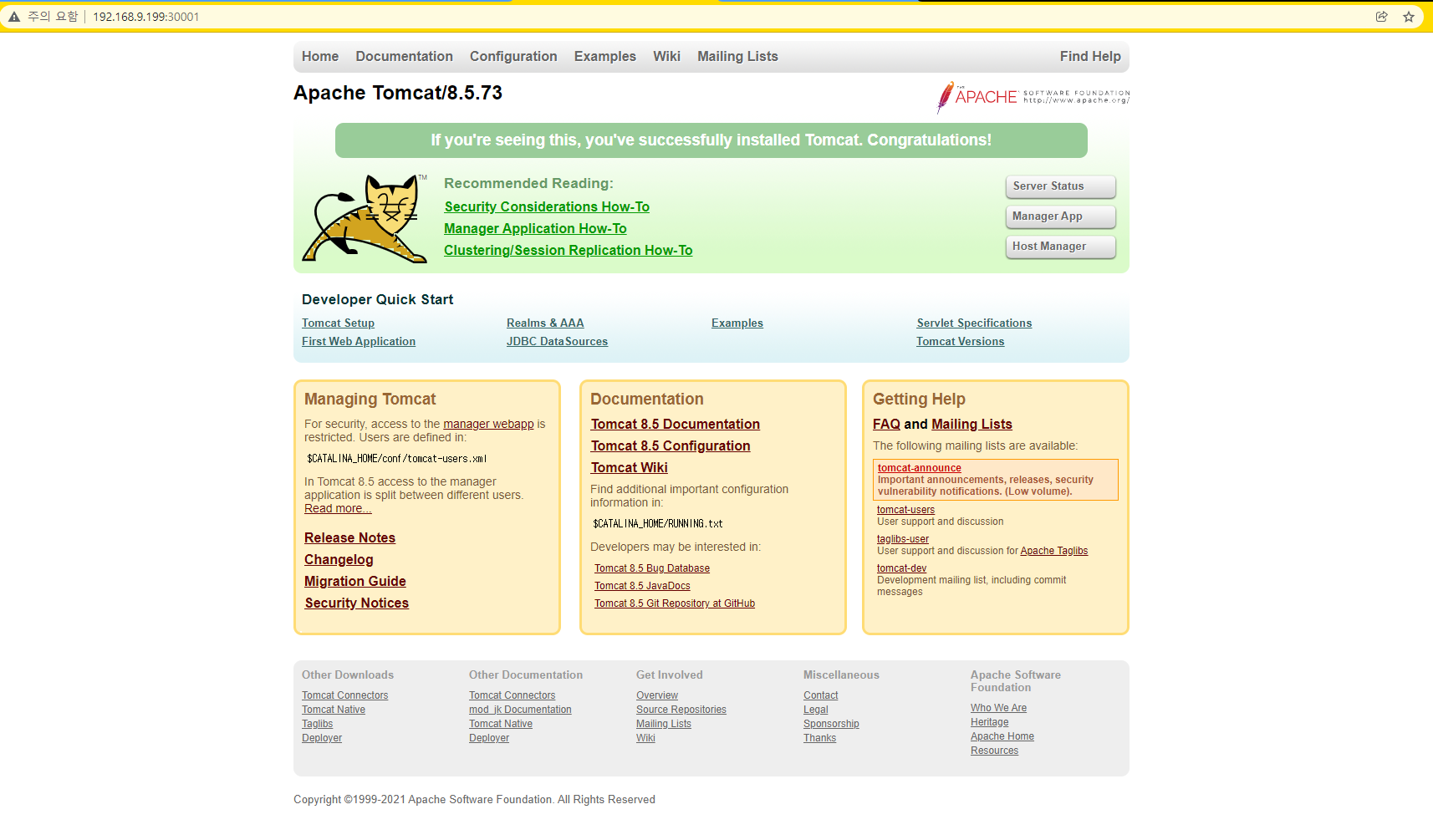 크롬창에서 http://[cluster가 구성된 node의 ip]:[nodeport로 노출된 tomcat service의 port번호]로 접속합니다.nodeport 번호는 30001번으로 지정했으니 url은 예시로 http://192.168.9.199:30001 가 됩니다.