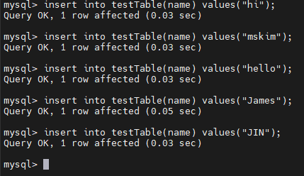 insert into testTable(name) values("mskim");