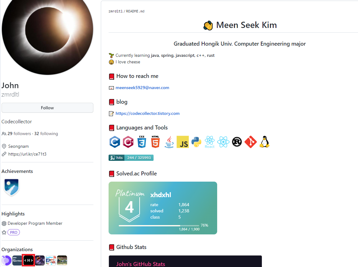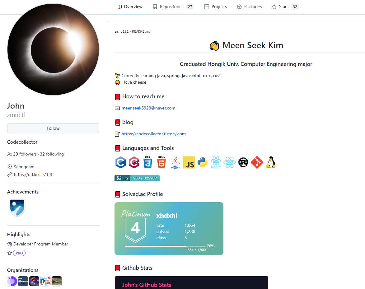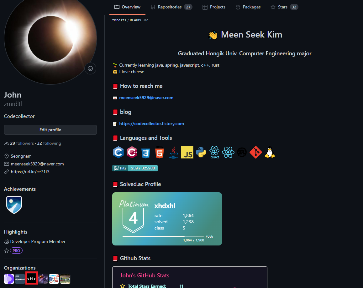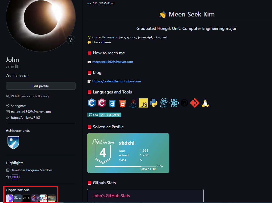 제 계정으로 들어오면 이런 식으로 제가 속한 organizations가 좌하단에 보입니다.