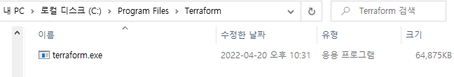 C:\Program Files 경로에 Terraform folder를 만든 뒤 해제한 exe file을 folder하위에 다음 사진처럼 저장합니다.