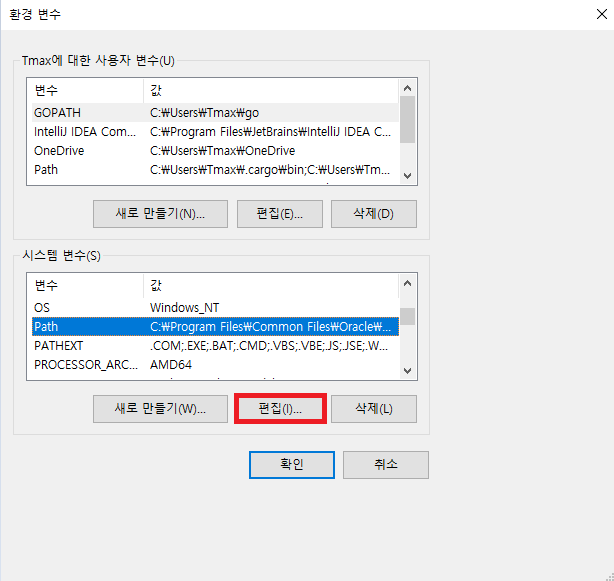 시스템 속성 -> 환경 변수 button click