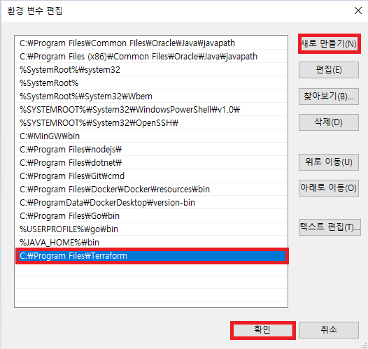 새로만들기 click -> C:\Program Files\Terraform 입력 후 확인 click