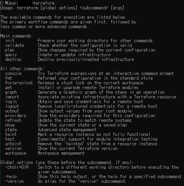 cmd 또는 bash 또는 powershell에서 terraform명령어 이후 출력여부 확인