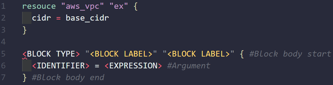 HCL상 객체의 정의부입니다. type, label, body로 구성되어 있습니다. body는 {}로 감싸 표현합니다.