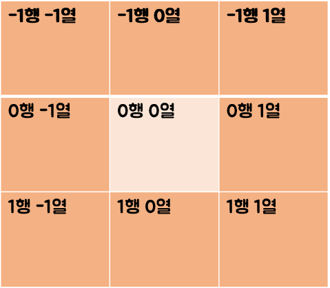 조건에 따라 지뢰의 개수를 확인해 ans에 저장합니다. 이차원 for loop를 수행하면서 자신이 r행 c열이라고 가정했을 때 자신을 0행 0열 기준으로 잡고 dr, dc에 따라 다음과 같이 인접한 8칸의 좌표를 구해 ans[r][c]를 구합니다.