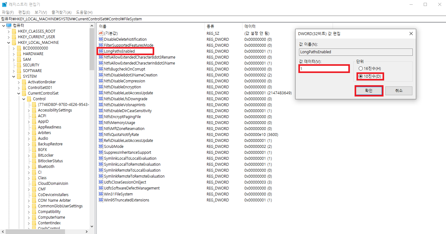 컴퓨터\HKEY_LOCAL_MACHINE\SYSTEM\CurrentControlSet\Control\FileSystem 경로에서 LongPathsEnabled 부분을 double click. 값 변경 후 확인