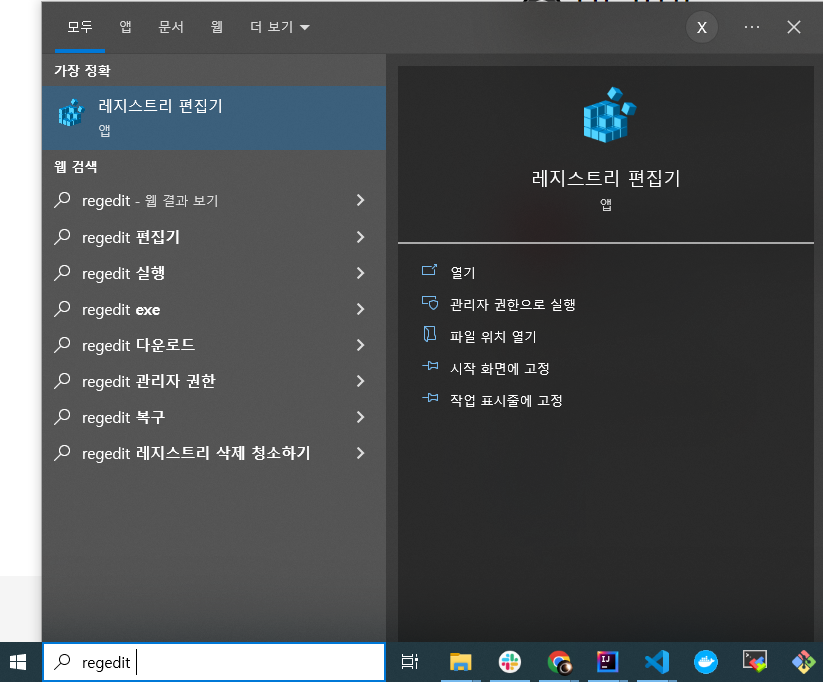 다음처럼 regedit을 입력해 열어줍니다.