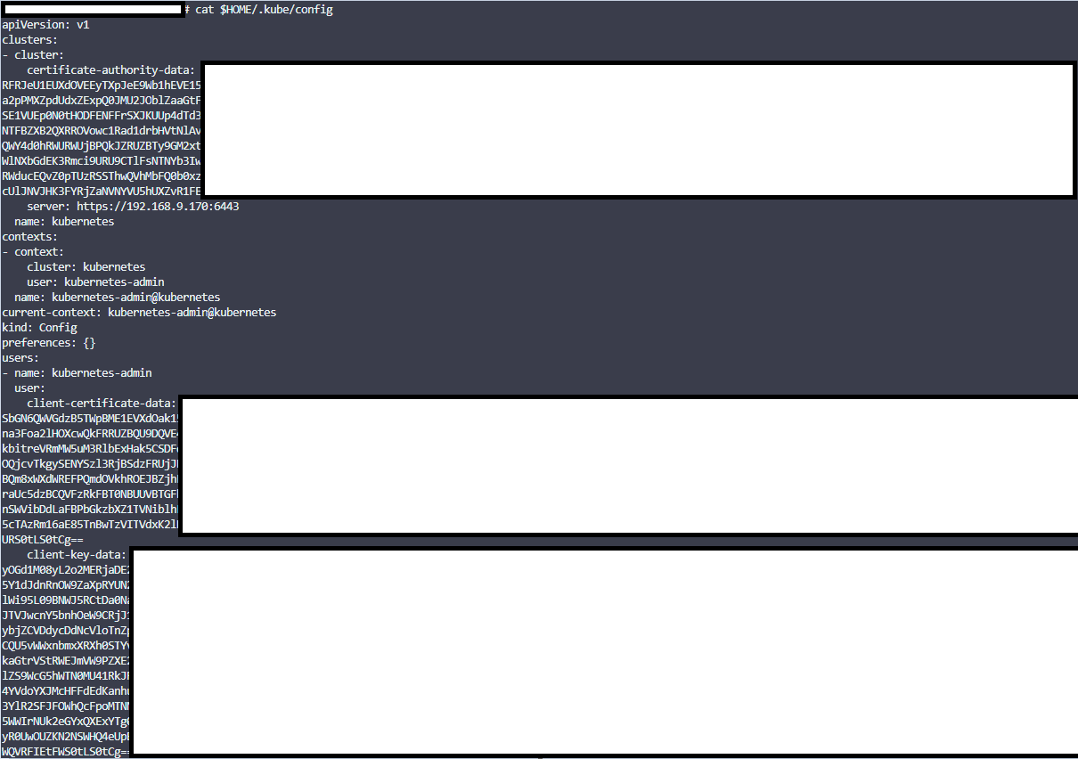 주로 cluster config file은 cluster환경이 갖춰진 local computer내에서 /root/.kube/config로써 존재합니다. cat명령어로 내용을 찾아 출력해봅니다.