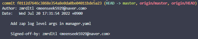 Author는 원래 code를 작성한 사람입니다. Committer는 원작자를 대신해 commit을 한 사람으로 간주됩니다. message내용 하단에 Signed-off-by가 되어 있는 것을 볼 수 있습니다. 이 부분이 DCO에 동의를 했고 해당 commit에 기여한 개발자를 의미합니다.