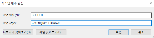 설치 경로는 defulat로 C:\Go\ 가 됩니다. 제 경우에는 C:\Program Files\Go에 설치했습니다. 이제 경로에 주의해 환경 변수 등록을 해줍니다.