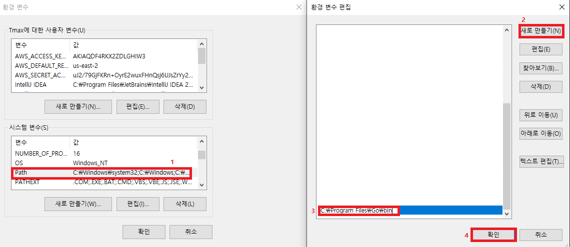 설치되면 Path에 go가 설치된 경로가 추가되나 혹시 없다면, Path에 go bin을 넣어줘야 합니다.