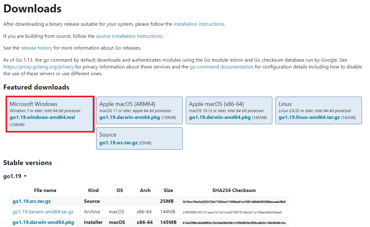 Downloads After downloading a binary release suitable for your system, please follow the installation instructions. If you are building from source, follow the source installation instructions. See the release history for more information about Go releases