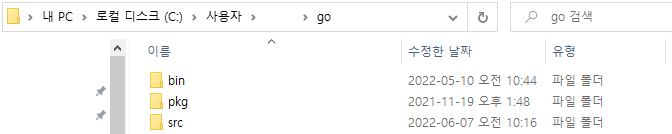 주로 C:\user\{user명}\하위에 go folder 내 bin pkg src folder가 존재해야합니다.