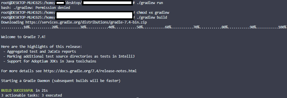 다음 명령어 입력해 권한을 준 후 다시 gradlew명령어를 사용해봅니다.