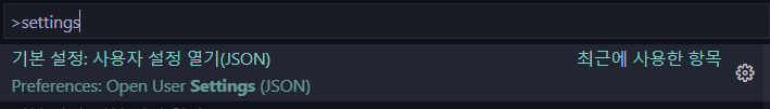 vs code 내에서 crtl + shift + p 입력하면 다음처럼 검색창이 나오는데 settings라고 입력해주면 사용자 설정을 json형태로 열 수 있습니다. enter입력 해 settings.json이라는 file을 열어줍니다.