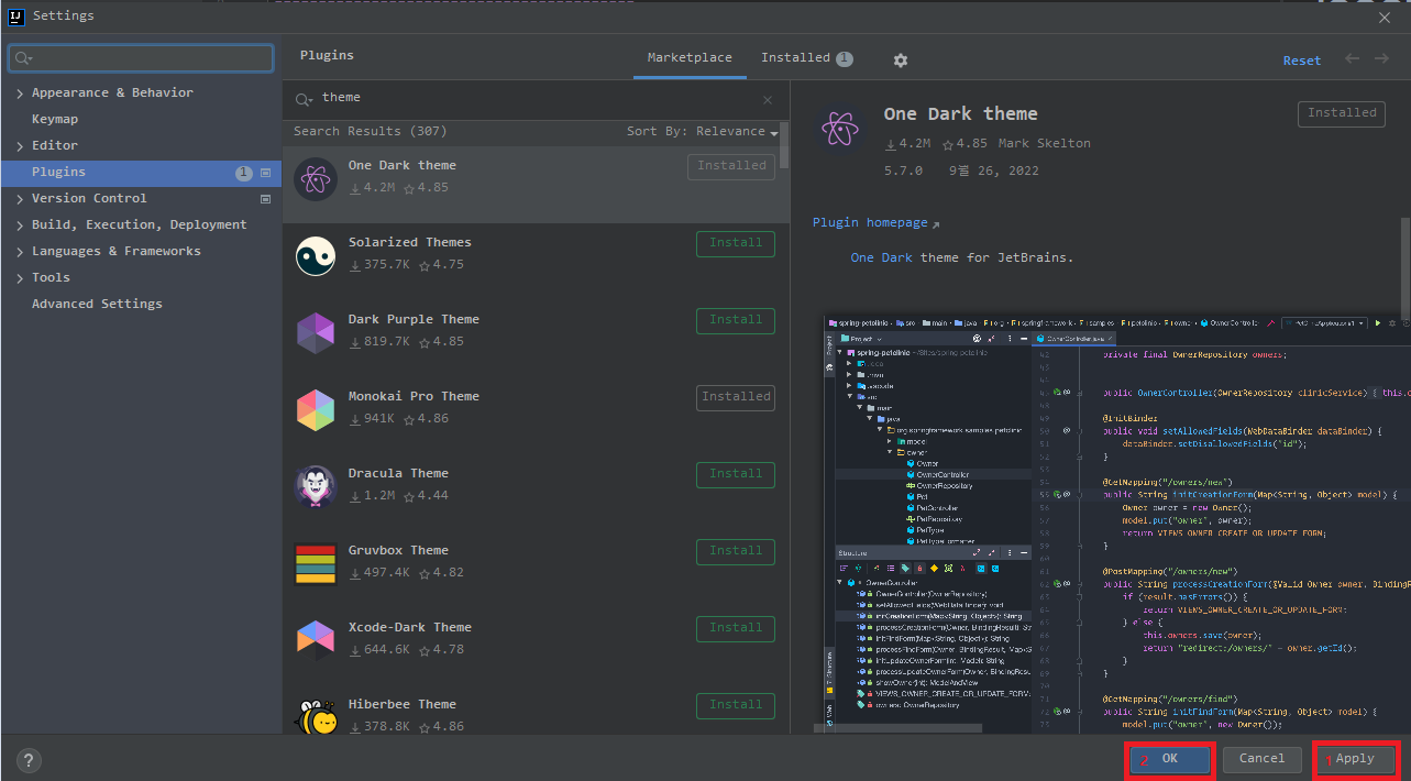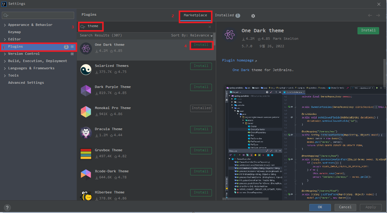 Plugins -> 우 중앙 Marketplace click -> theme검색 -> 원하는 theme install