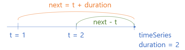 이 경우 t시점에 공격을 받았을 때 duration만큼 더해주는 것이 아닌 겹치는 구간을 빼줘야 합니다. 이는 초록색 선으로 표시된 구간으로 next - t 만큼입니다. 따라서 t시점에 공격당했을 때 독에 당한 시간은 duration - (next - t) 만큼이 됩니다. 이 값을 totalPoisoned에 더해줍니다.