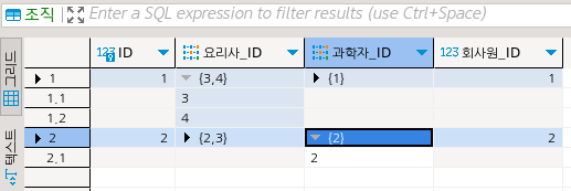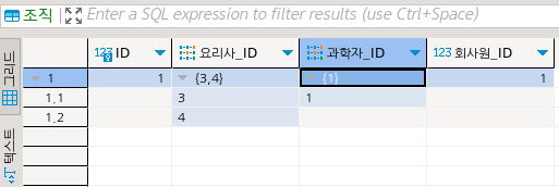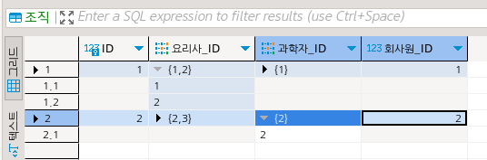 조직, 요리사, 과학자, 회사원 table이 존재하며 조직이 요리사, 과학자 id 들을 varray로 들고 있습니다. 하나의 조직에 속한 여러 요리사들과 과학자들 그리고 회사원을 의미합니다.