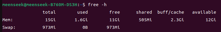 사용 가능한 RAM과 사용 중인 RAM을 표시하는 명령어 입니다. -h option으로 MB 또는 GB가 보이게 가독성을 챙겨줍니다.
