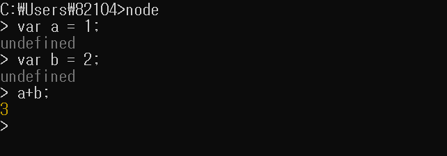 cmd에서도 명령어를 통해 자바 스크립트 언어로 된 파일을 읽어 출력하거나 코딩이 가능하다. 실행창을 열고 node라고 쳐본 뒤 앞의 코드를 작성해보면 같은 방식으로 출력이 됨을 알 수 있다.
