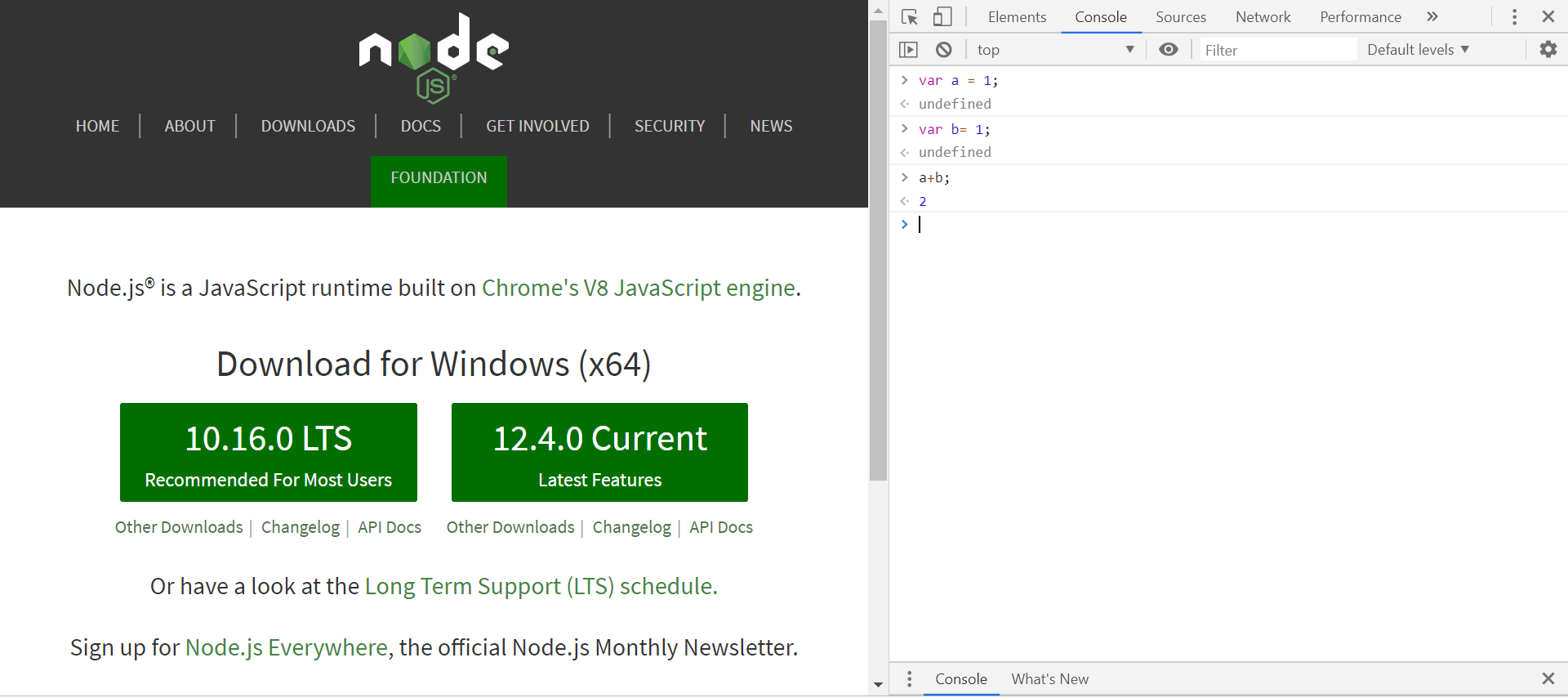 크롬이 한 화면이었던게 갑자기 이렇게 반쪼가리가 된다. 이것이 개발자 콘솔인데 여기서 자바스크립트 문법을 쳐서 컴파일링 할 수 있다. 콘솔창에 써져있는 저 코드를 한 번 따라쳐 보면 놀랍게도 실행결과가 같음을 알 수 있다. 이는 크롬안에 REPL(Read,Evaluate,Print,Loop)가 내장되어 있어서 내가 친 코드값에 대해 REPL을 하기 때문에 한줄 한줄 저렇게 결과값을 띄워준다. 첫번째 줄에 >표시는 입력을 받을 준비를 하고 있다는 뜻이다. var a = 1; 라는 변수를 선언했고 이제 엔터를 치니 <- 표시가 나온다. <-는 print한다는 뜻이다. 그런데 변수를 선언만 했으므로 print의 값이 undefined 되었다는 뜻이다. 마지막 a+b;를 했을때는 연산 결과를 알아서 출력해준다.