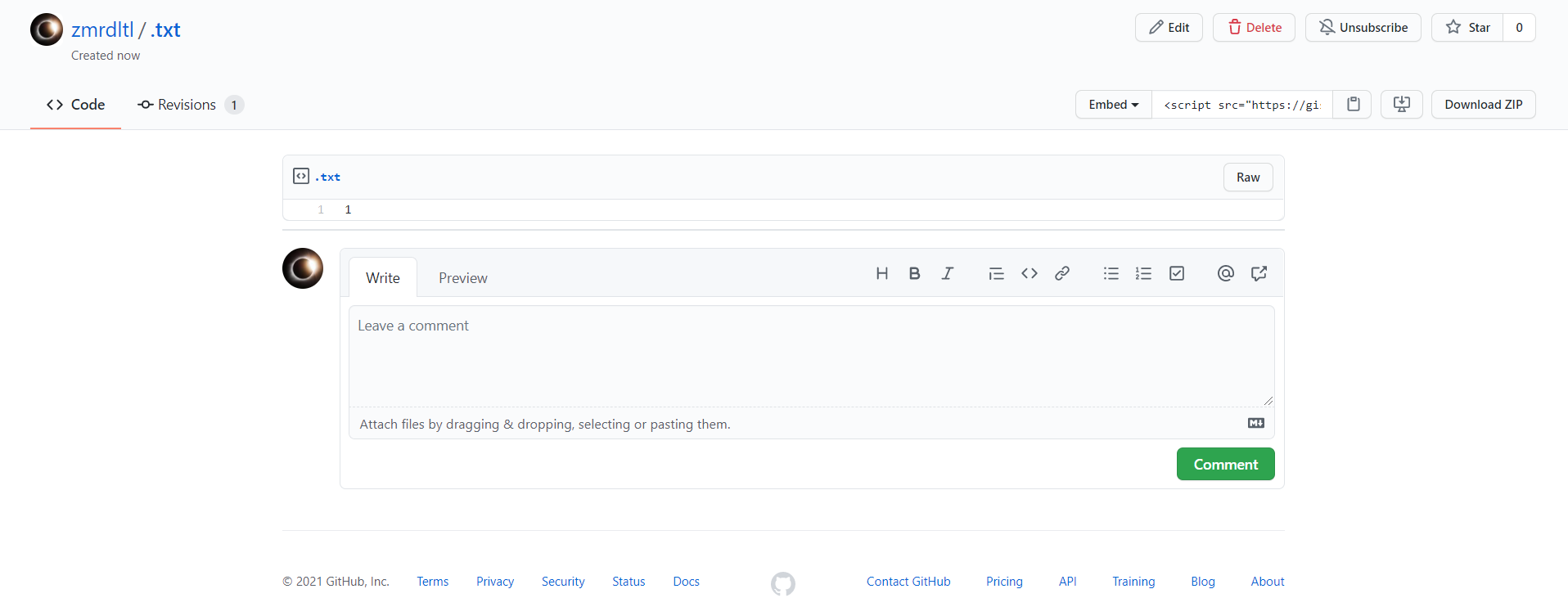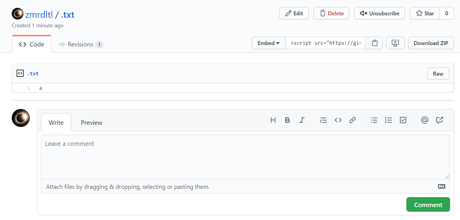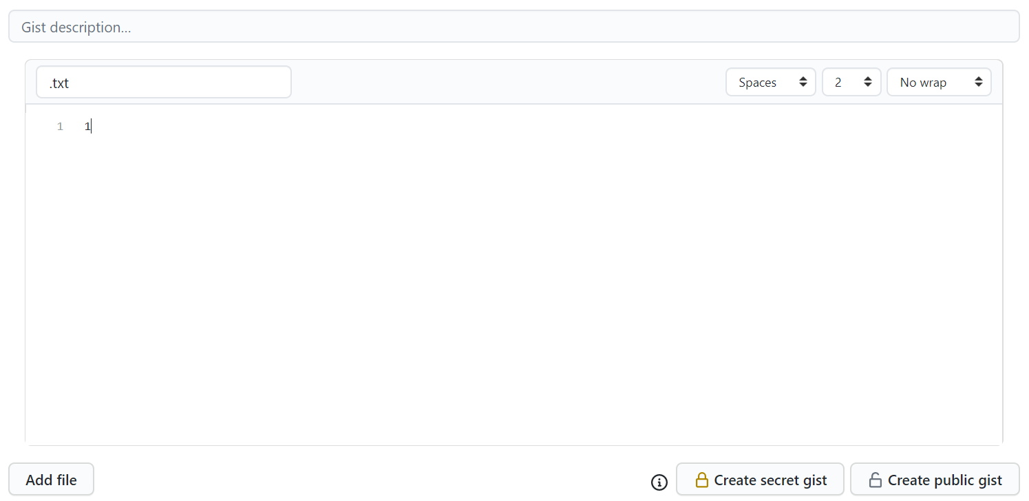 이후 상기와 같은 화면이 뜬다면 만드는데 성공한 것입니다. .txt를 제목으로 글의 내용은 1로 입력한뒤 create public gist를 버튼을 눌러줍니다.