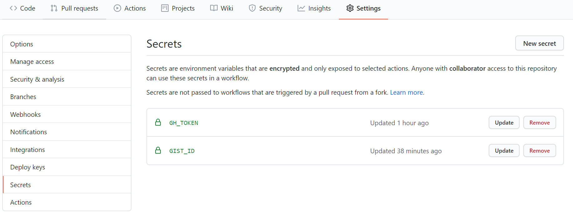헉헉 이제 추가가 완료된 두개의 secrets을 settings화면에서 볼 수 있습니다.