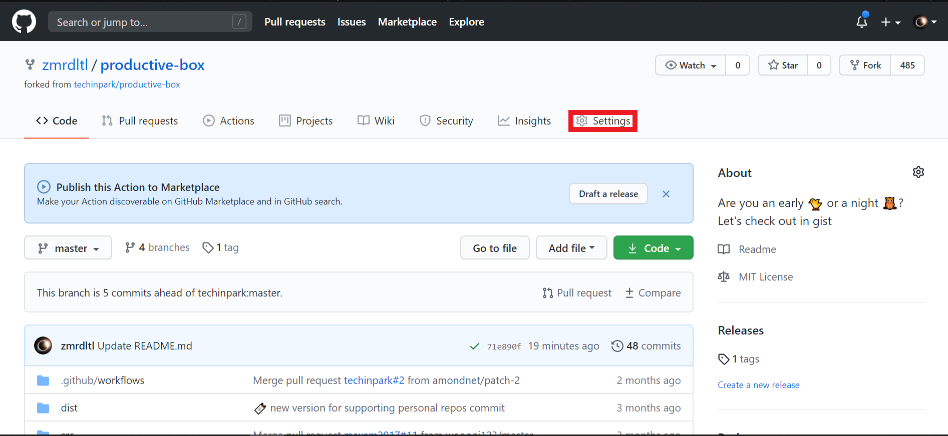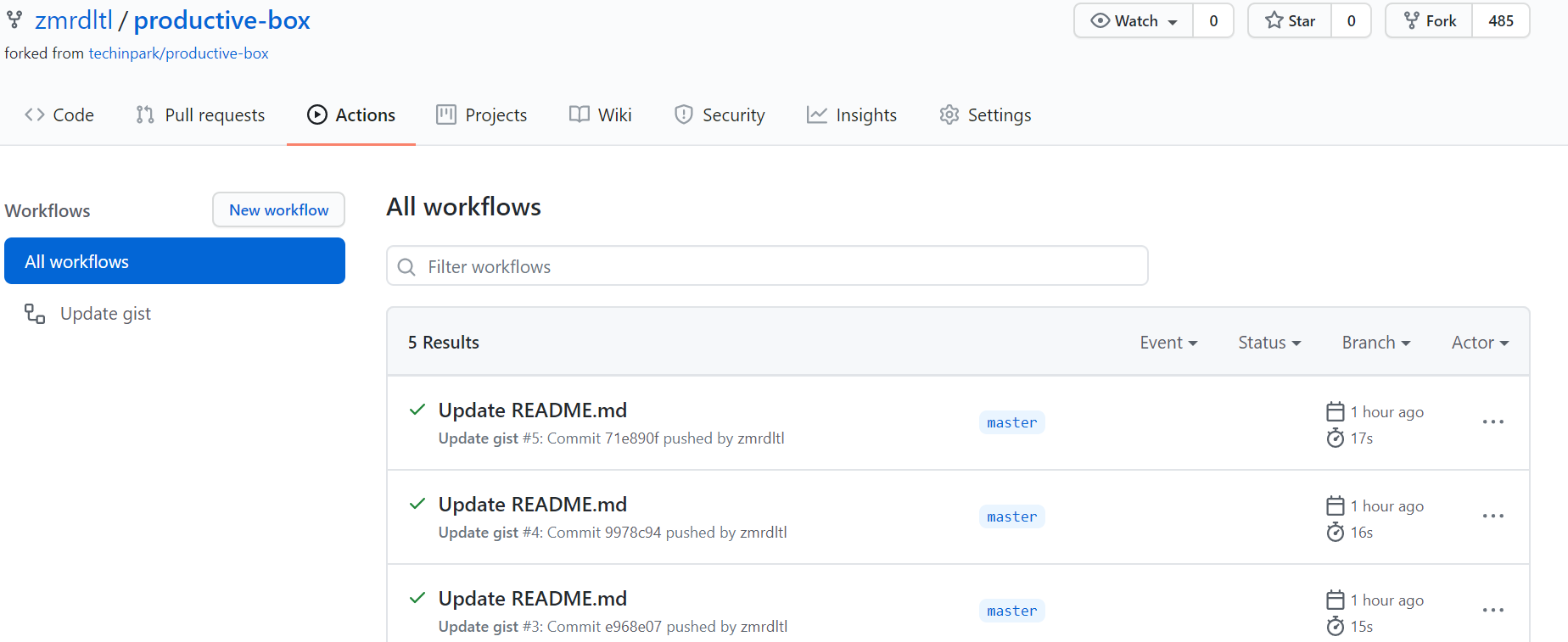 그 후 productive-box를 클릭해 actions 탭에서 enable 버튼을 클릭해 줍니다. 그러면 앞으로 이 창에서는 제가 fork한 project의 update 기록현황이 보입니다.