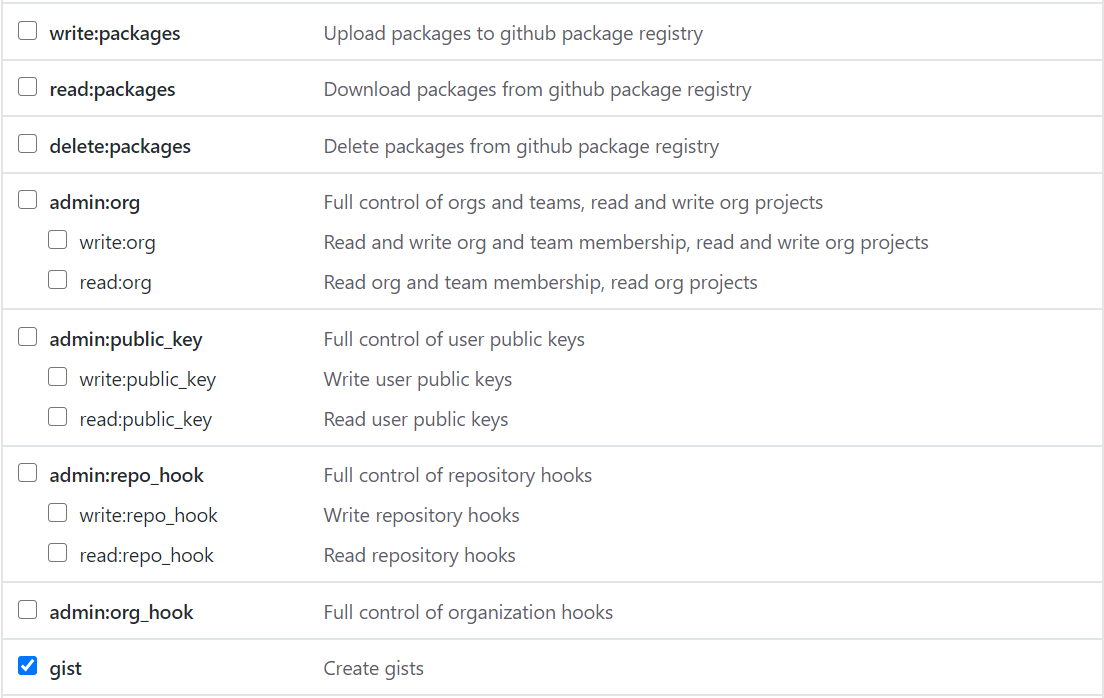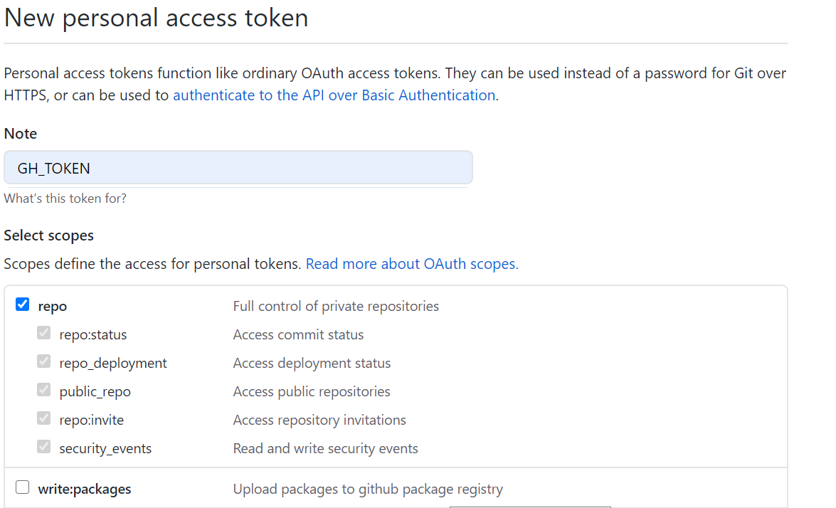 접속하여 GH_TOKEN이름으로 repo, gist checkbox를 check해줍니다. 그 후 generate token 버튼을 클릭하여 생성해 줍니다.
