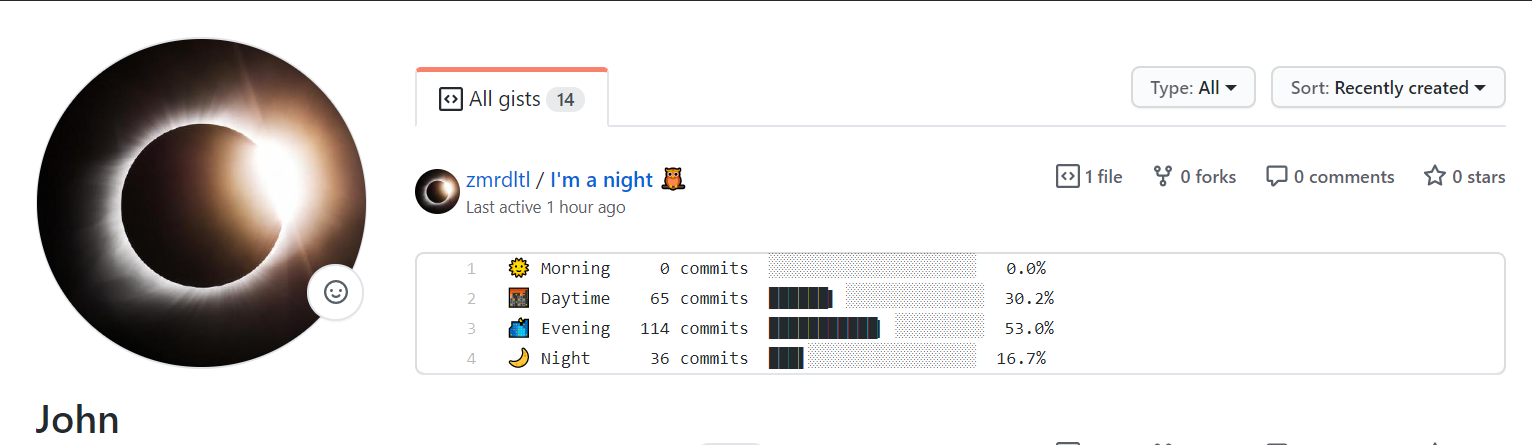 이제 매 정각에 update되어 시간대별 commit이 하루를 100%로 하여 제가 추가했던 public gist .txt파일에 뜰겁니다.
