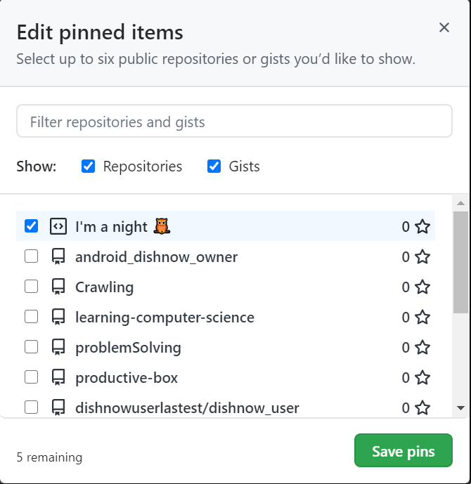 그 후 다음 항목에 check해주면 앞으로 제 프로필 최상단에 pinned됩니다.