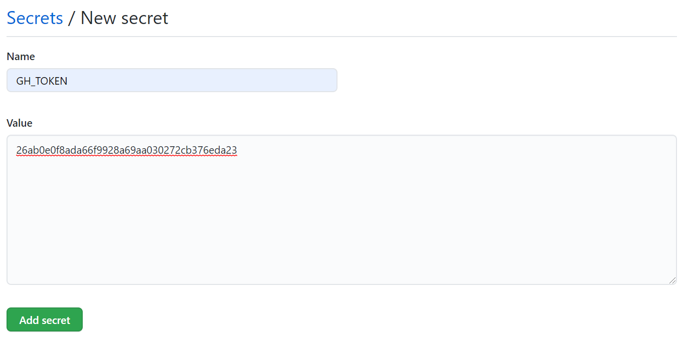 제목 : GH_TOKEN, value : 26ab0e0f8ada66f9928a69aa030272cb376eda23(내가 생성했던 token값) 입력후 Add secret