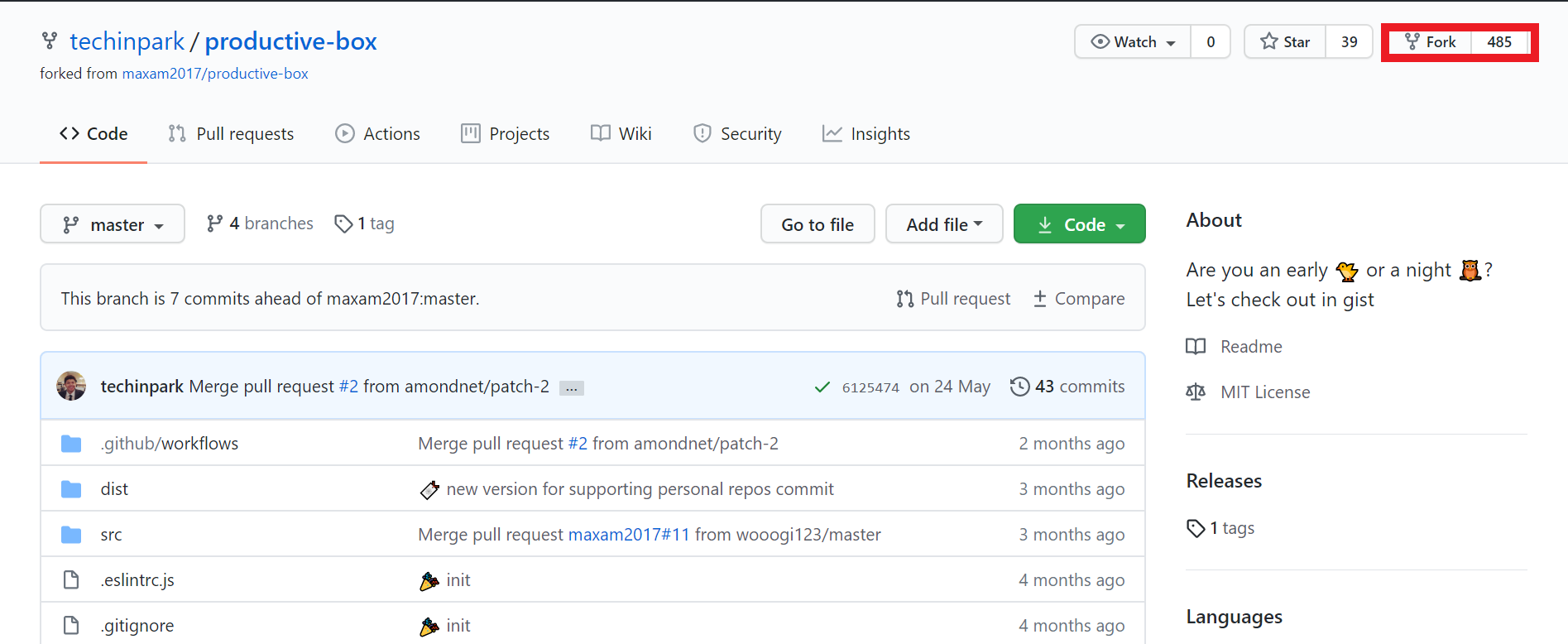 원작자의 project에서 시간대를 한국/서울시 기준으로 맞추기 위해 약간 수정되었다고 합니다. 아래 repository를 fork하도록 합니다. https://github.com/techinpark/productive-box