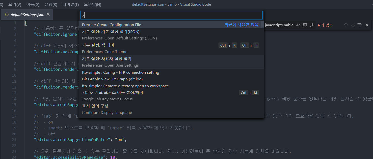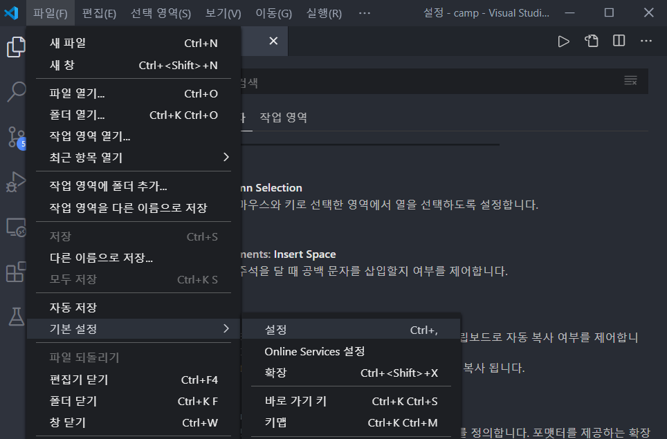 1. 파일 -> 기본설정 -> 설정을 누릅니다.