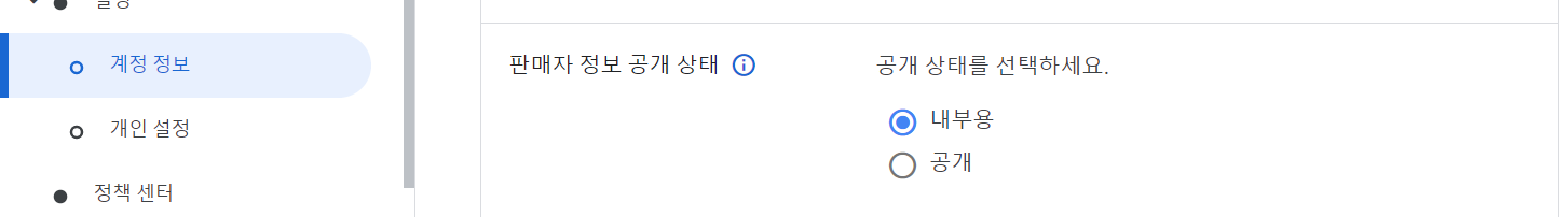 좌측 side bar에서 계정 정보를 누르면 판매자 정보를 볼 수가 있습니다. 그 중 판매자 정보 공개 상태를 선택할 수 있는 다음과 같은 그림이 있는데 현재 내부용으로 되어 있는 것을 공개해주시면 됩니다.