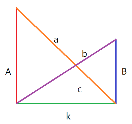 입력받는 x,y를 각각 a,b라고 가정한 뒤 구하려는 값을 k, 두 빌딩의 높이를 각각 A,B라고 가정했습니다. 이 때 가장 왼쪽 하단 꼭지점을 0,0으로 하여 직선 a,b에 대한 방정식을 구했습니다. 이 정보들을 공식으로 표현하면 다음과 같습니다.