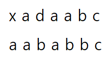 두 번째 비교는 상기와 같습니다. a문자열의 제일 앞 x알파벳은 임의의 알파벳으로 아까와 마찬가지의 가정을 세웠기에 비교 대상에서 제외시킬 수 있습니다. 여기에서 첫 번째인 x를 제외한 뒤 b 문자열과 차이를 구하게 된다면 세 번째, 다섯 번째 알파벳이 서로 다르므로 2개가 됩니다.