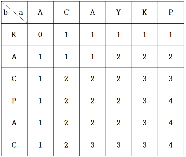 이때 a의 i번째까지의 문자열과 b의 j번째까지의 문자열의 lcs를 구하게 되면 곧 답이 된다는 dp식을 유도할 수 있습니다. 두 가지의 정보가 필요하므로 2차원의 배열을 사용한다면 모든 정보를 표현할 수 있습니다.